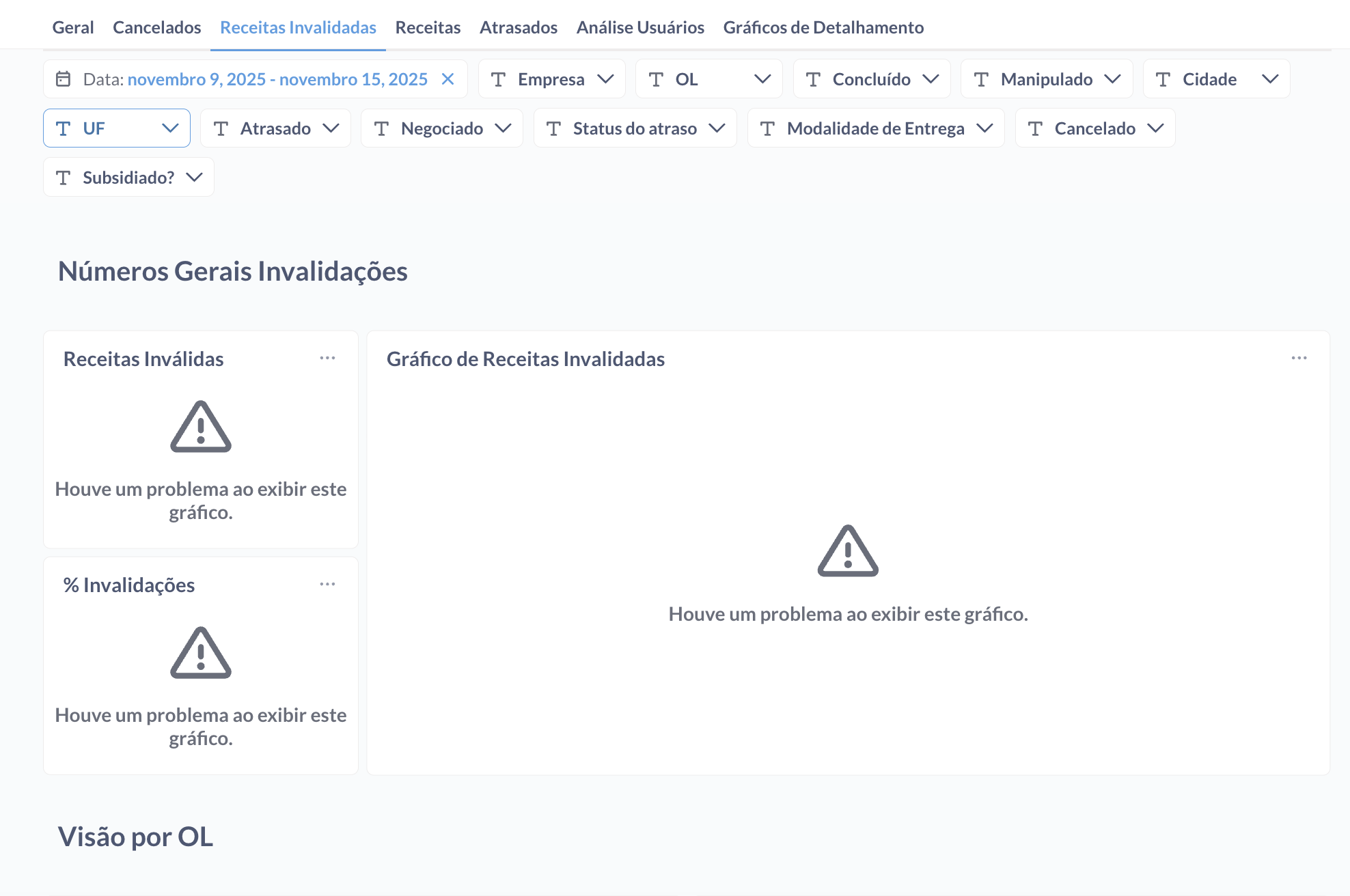 Não conseguimos carregar nenhuma visão relacionada à invalidação de receitas no dashboard "Análise Operação"